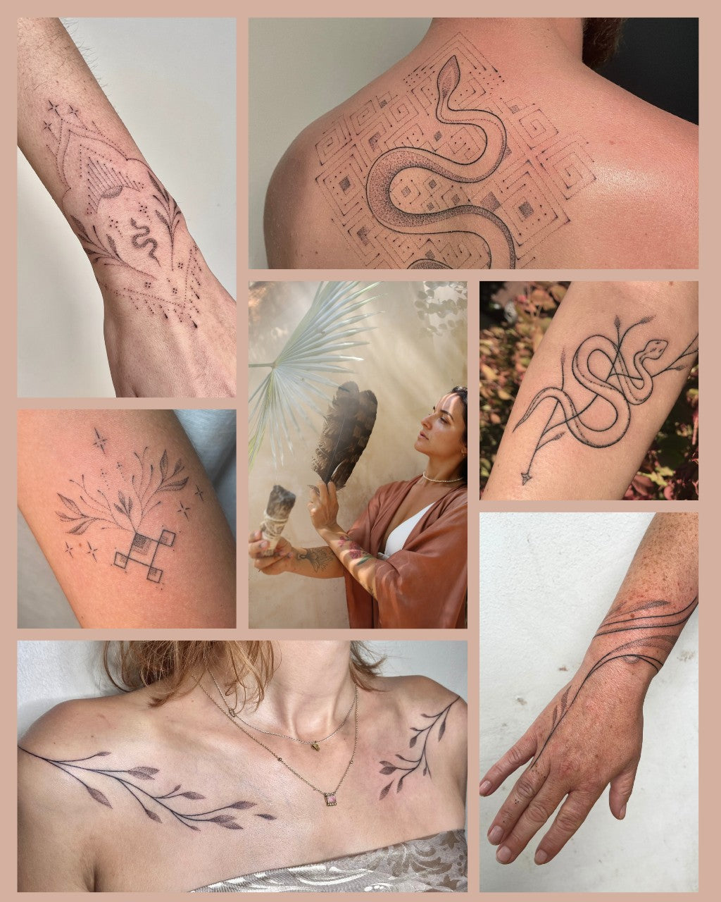 With over 8 years as a handpoke tattoo artitst and several certificates in holistic therapies, Manuela's spiritual path is reflected in her tattoo ceremonies. She works with an ancestral tattooing technique called handpoke and uses quartz crystals as support for the needles, which infuse your Talisman with crystalline frequency.